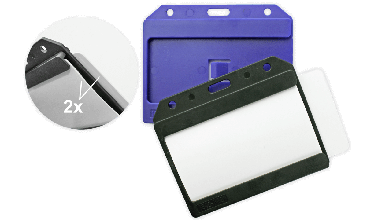 - This versatile credit card size holder can hold 1 ID card on one side and 3 cards (750 mic) or 6 business cards on the back side.