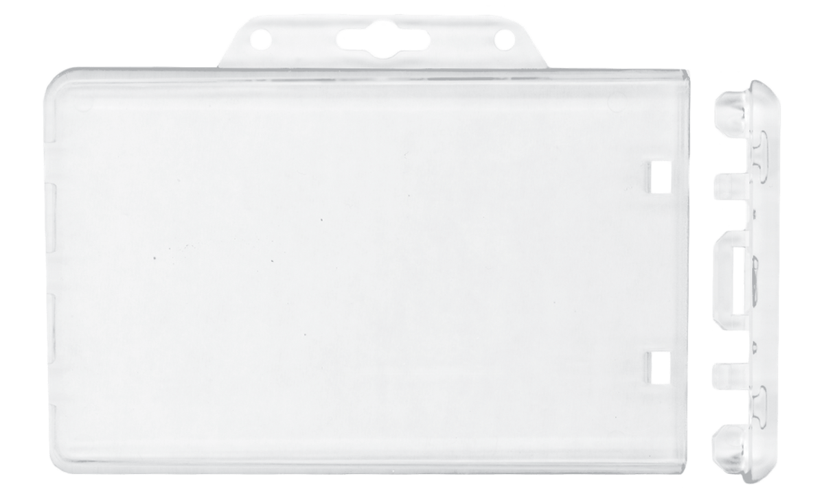 Clear thick ABS material with permanent locking end-piece. Holds two cards horizontally.