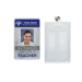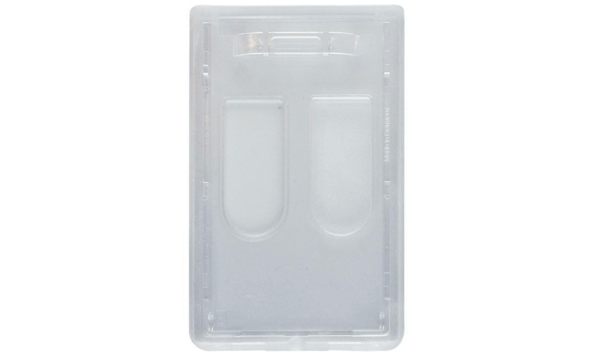 Made of durable, fire-retardant polycarbonate. UV protection prevents print fading for less frequent card replacement. Frosty finish hides scratches and eliminates glare. Back slot allows easy attachment to lanyard or badge-reel with strap.