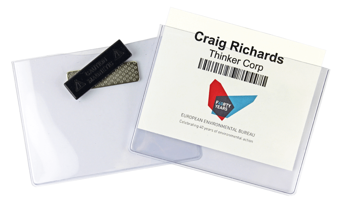 Reusable name badge solution made of a strong and flexible acetate which features a magnetic attachment.