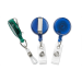 Round plastic badge reel with clear vinyl strap and nylon cord. Slide-type belt clip on back to easily attach to your clothing.