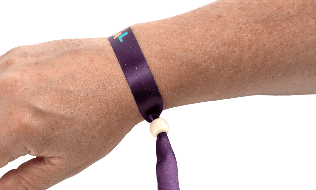Montreal satin wristbands feature a wood reusable ring. This ring closure enables the satin wristband to be readjusted for re-use.