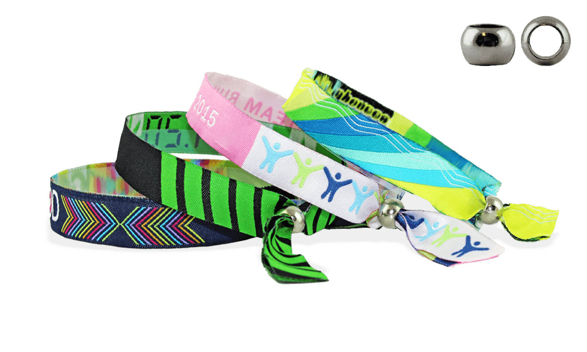 Las Vegas woven wristbands feature a metal reusable ring. This ring closure enables the woven wristband to be readjusted for re-use.