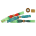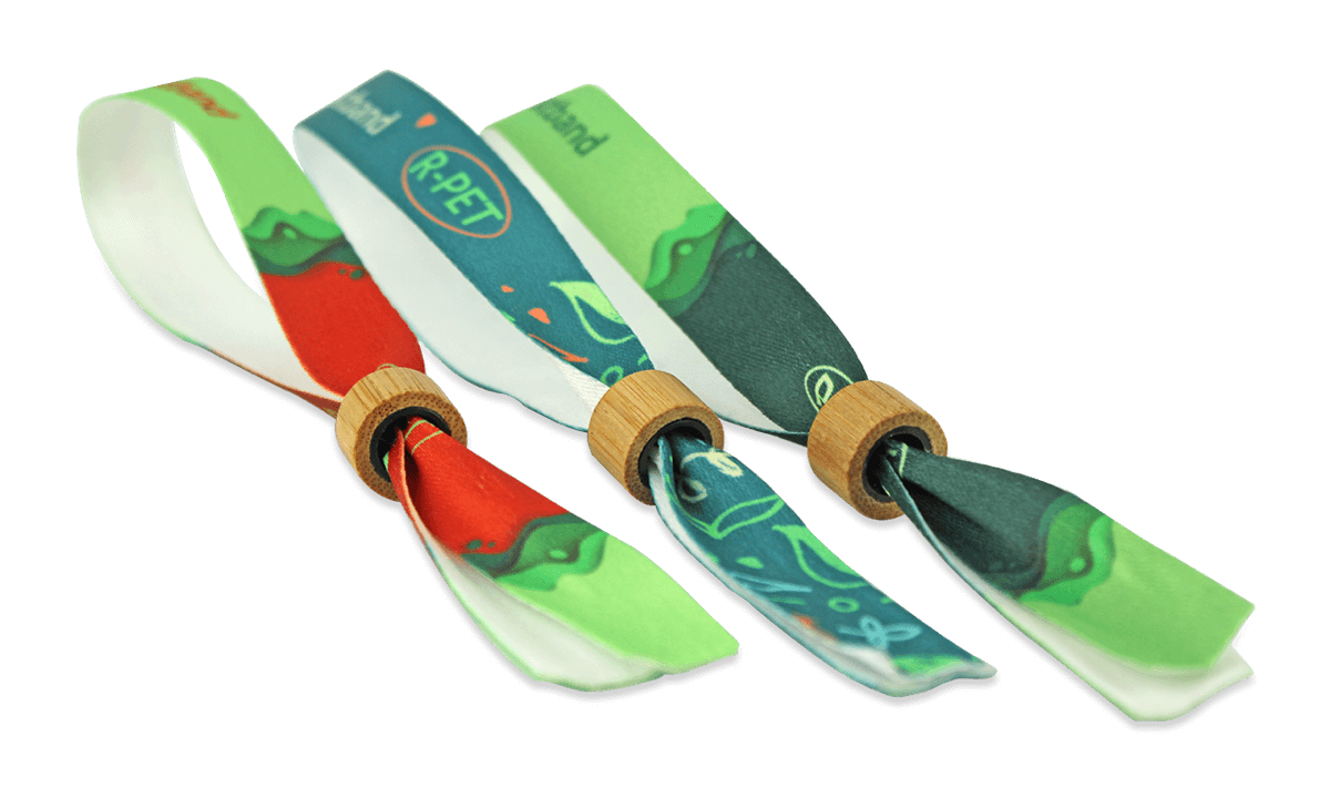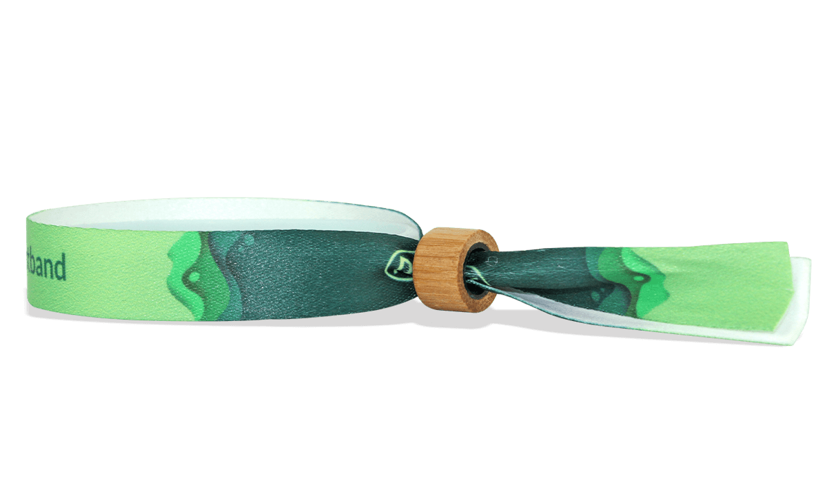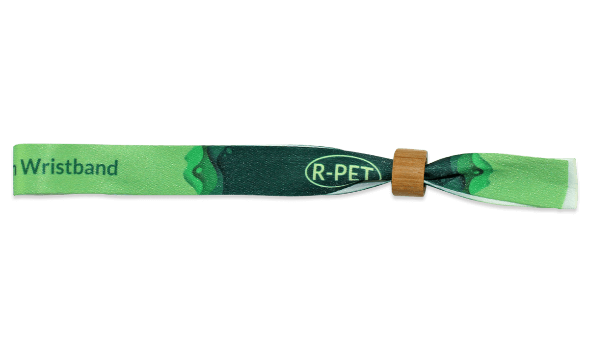 This wristband is made from a 100% post-consumer recycled polyester content (R.P.E.T.) sourced from recycled plastic bottles. It features a one-time use eco-friendly sliding closure made from 50% sustainable bamboo (shell) and 50% recycled plastic (secure lock). This closure ensures a highly secure control access as it makes the wristband not transferable.