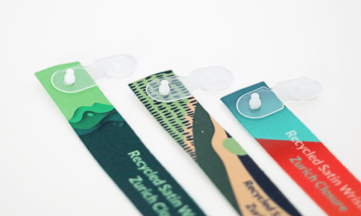 Recycled P. E. T. satin wristbands with button clip closure, Zurich